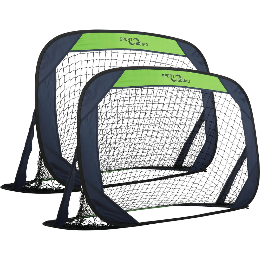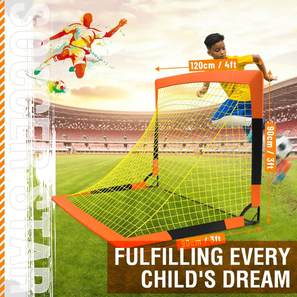 INCLUDES: The set includes two 4' x 32" pop-up soccer goals, heavy-duty durable support steel stakes, and a compact carrying bag. Recommended for use with regulation soccer balls or kids' training soccer balls.