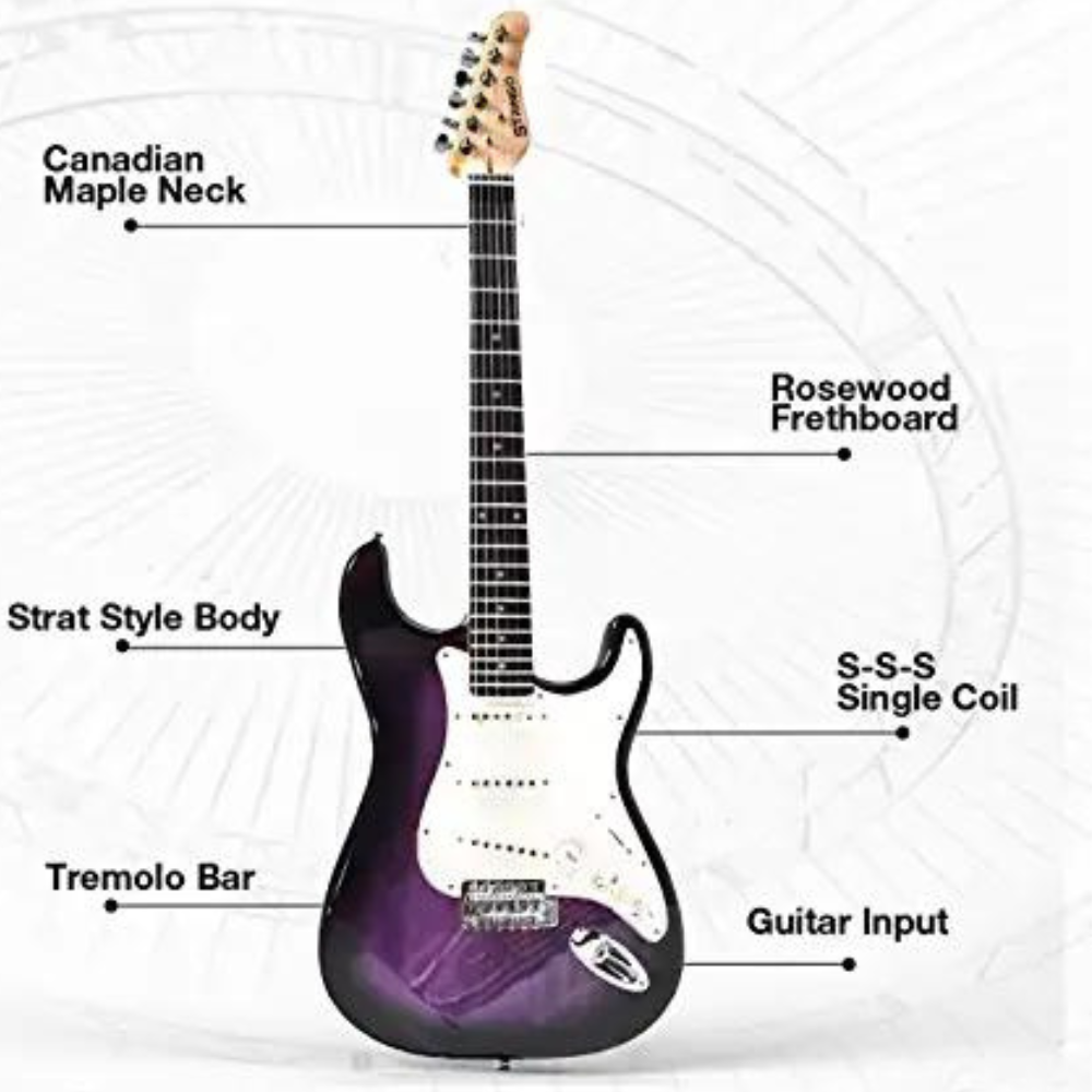 It comes with everything needed including the purple heart wood fingerboard, poplar solid body, and Canadian maple neck which has been designed so it fits comfortably in your hand while providing easy access at any angle!