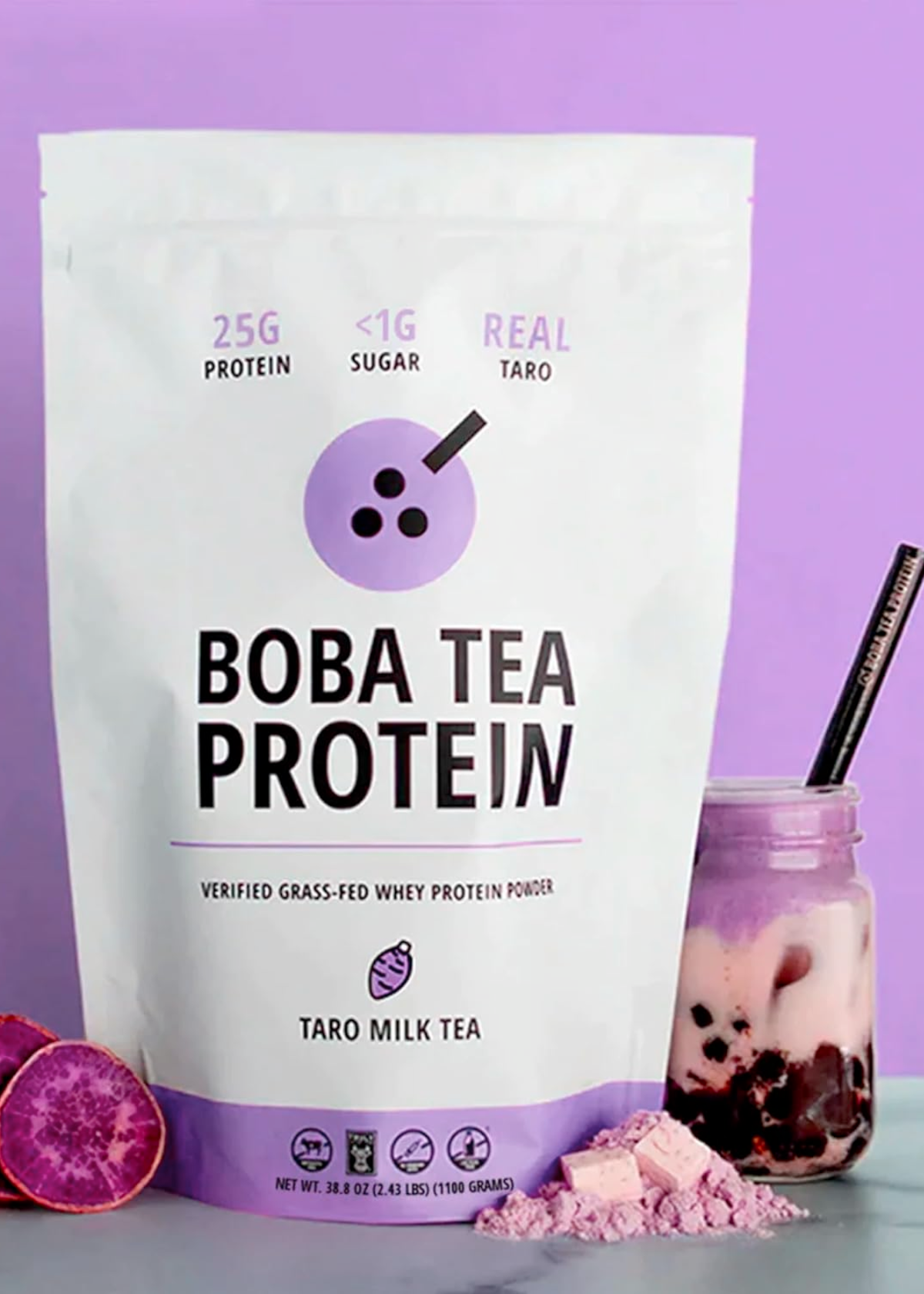 Experience the perfect fusion of premium teas with our Boba Tea Protein Taro Milk Tea—sans tapioca pearls, only the drink mix is included. Boasting 25g of wholesome protein derived from Truly Grass-Fed Verified cows, this low carb, low-fat powder blends Yunnan golden black and Assam black teas for a delightful boba tea flavor. Sweetened naturally with zero-calorie monk fruit and enriched with coconut extract creamer, our protein powder not only energizes your day but also provides antioxidants and polyphenols for overall health and well-being.