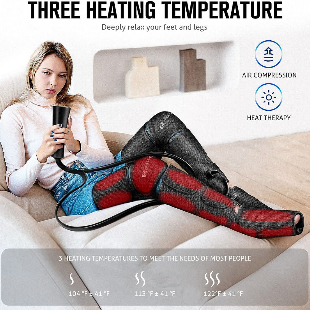 But that's not all – this leg massager also boasts a heating feature that's perfect for deep tissue massage, alleviating muscle tension in your feet, legs, calves, and thighs. With three-speed heating settings, it caters to various preferences, leaving you feeling completely relaxed and stress-free.