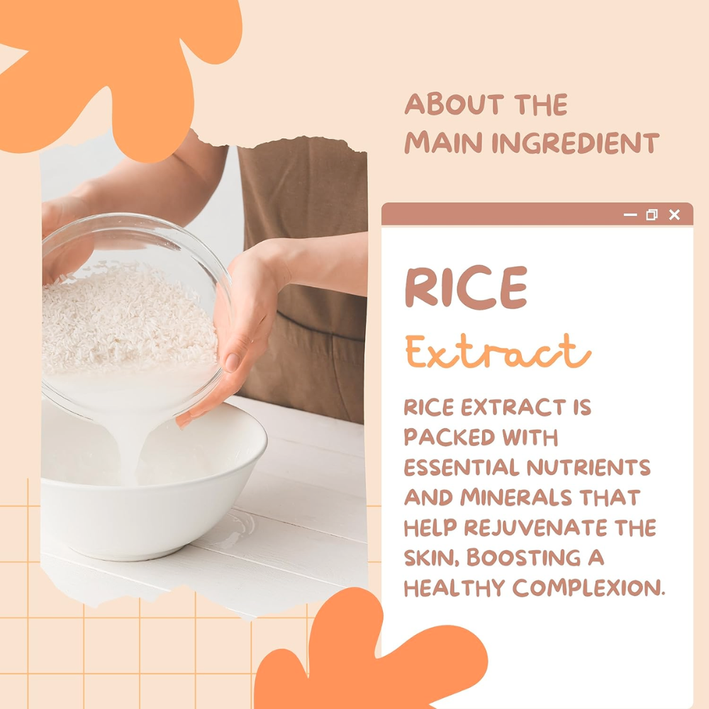 Nature's Brightener: Rice Extract, a natural luminary, serves as a potent brightening agent, purifying skin texture and harmonizing skin tone.