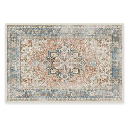 - Vintage-Inspired Design: The rug's vintage-inspired design features a bold medallion pattern and ornate border with shades of coral red and stone blue. It's purposefully distressed, giving it a rustic look that adds character and charm to any room.