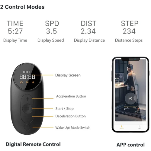 The remote control for this treadmill is designed with finger-feel key and a high definition screen. It is wireless, allowing you to operate the treadmill from a distance. The remote allows you to turn the machine on/off, switch between manual/automatic mode, adjust the speed (0.5~4MPH), and start/pause the treadmill. It also has a display that shows the speed, time, distance covered, and calories burned.