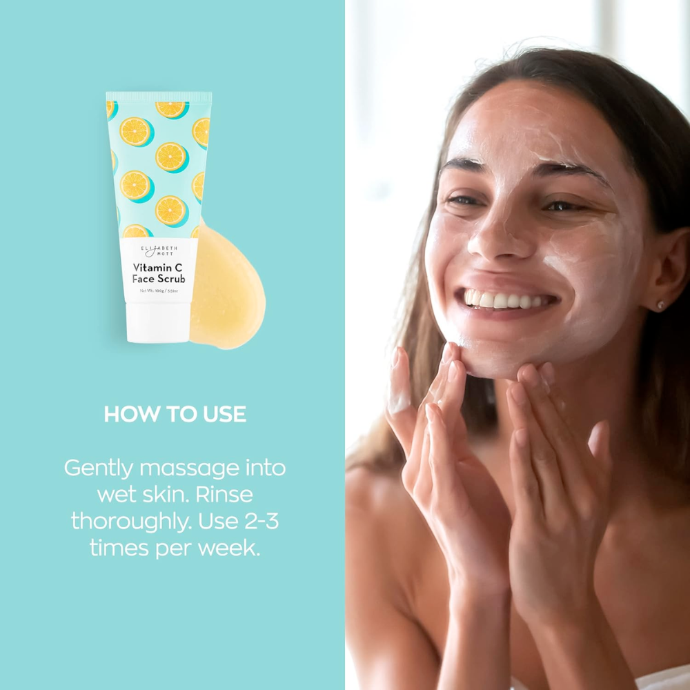 "Experience Brighter, Smoother, and Refined Skin: Our Vitamin C Facial Scrub is a gentle exfoliator designed to illuminate discoloration, diminish the appearance of fine lines and wrinkles, all while softening and hydrating your skin.